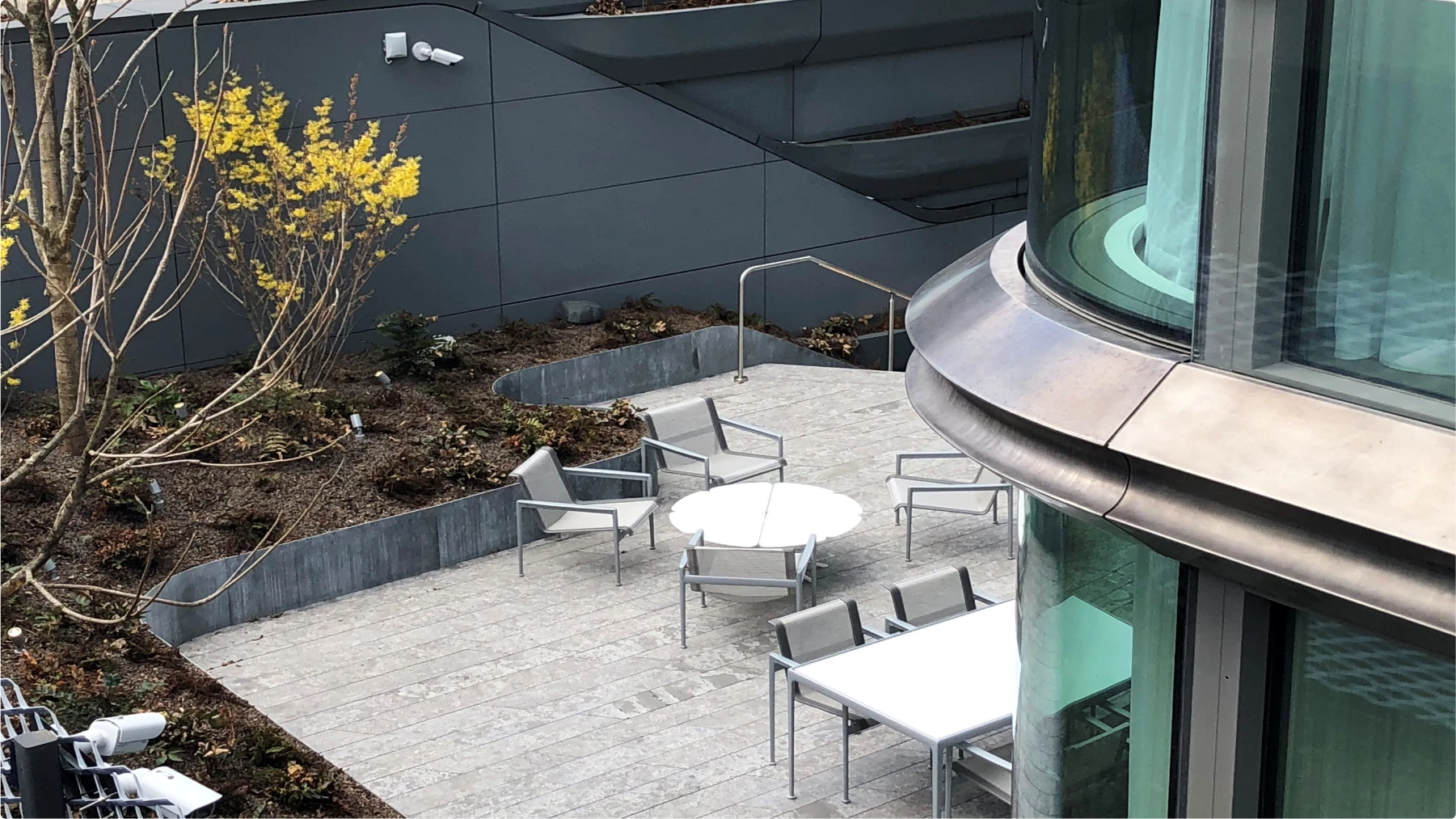 ORE produced a banded-mesh trellis that fit the building’s design to support a wall of greenery in the courtyard. To establish planting beds on a sloped, rolling patio, we took an innovative approach to leveling the retention edge that accommodates the irregular terrain. Structural posts, concealed within sleeves built for the site, allow for level planter edges that appear to float up and down with the changing grade. The system is placed with hidden fasteners to integrate with the building’s sinuous lines.