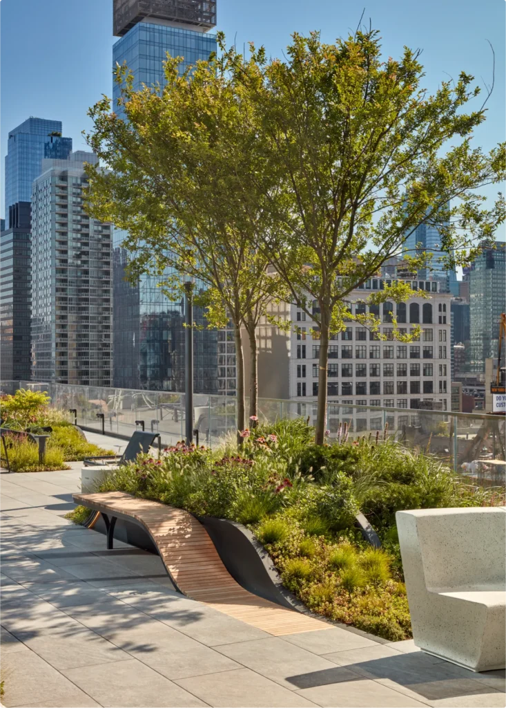 The façade of the 55 Hudson Yards office tower merges the contemporary energy of Hudson Yards with industrial features that pay homage to the history of the nearby Meatpacking District and SoHo neighborhoods. Wrapping around the entire perimeter of the building, a 10,000-square-foot terrace serves as a relaxing green area that promotes wellness and engages people both in and outside an art-filled, 10th-floor workspace. The design vision for the terrace called for landscape elements that complement 55 Hudson’s distinctive, stepped window mullions.