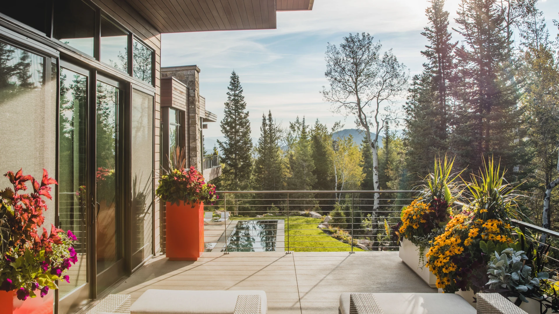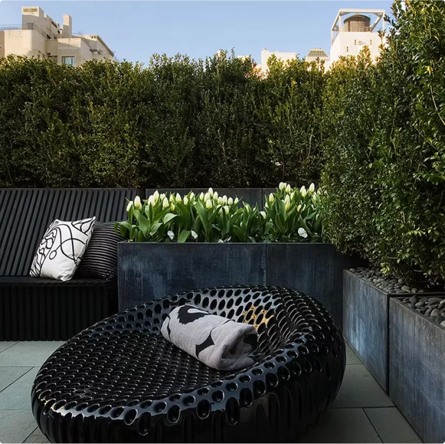 Other project highlights include a selection of our pre-designed planters in an oxidized patina. We arranged planters with different heights to serve as green-filled borders on a rooftop garden.