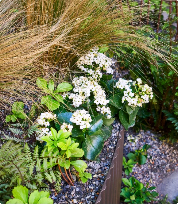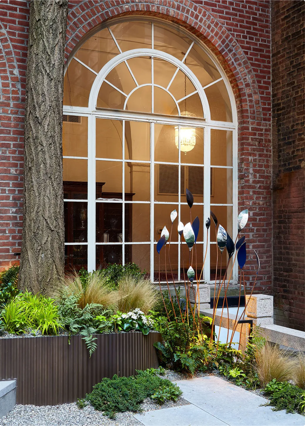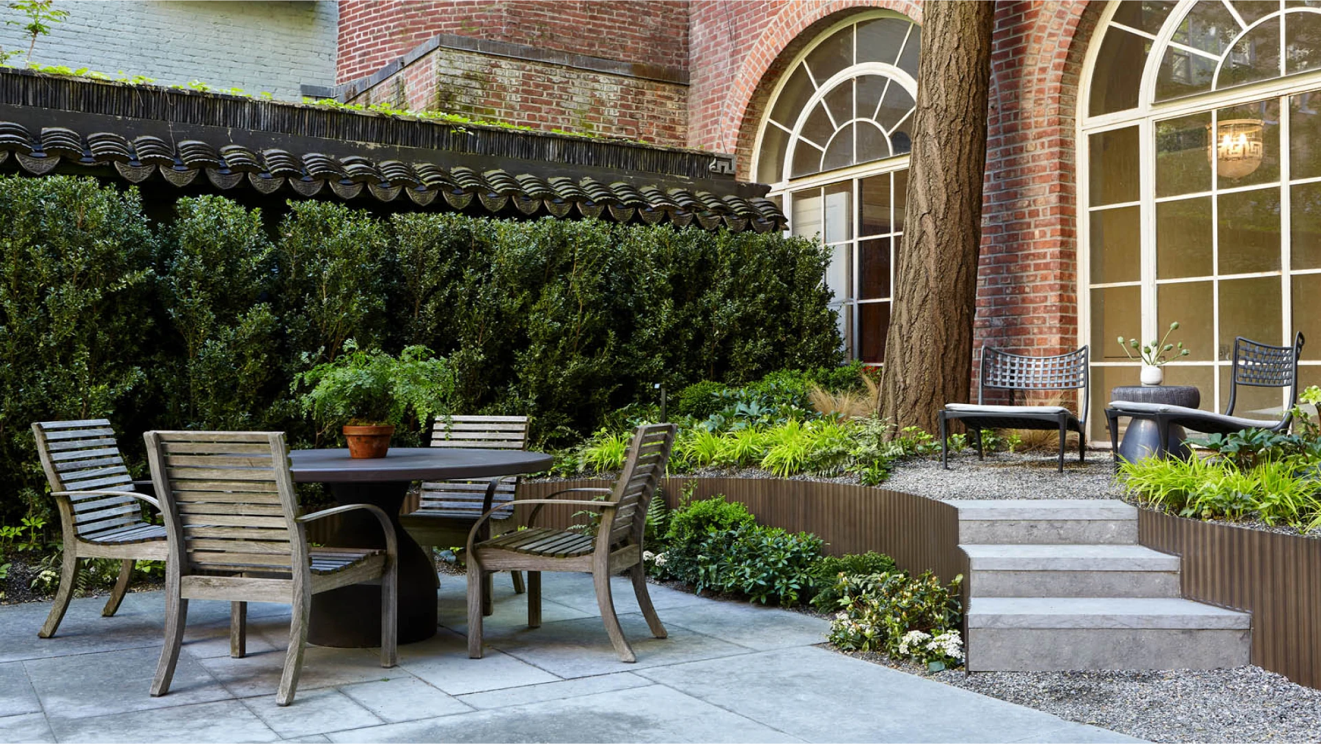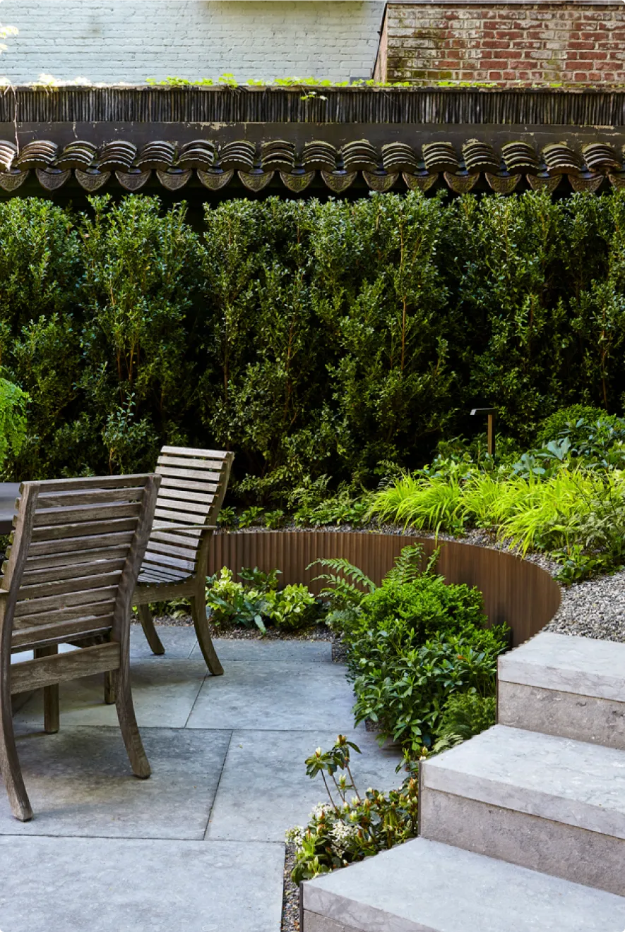 Through different iterations of the Show House, we have utilized a mix of our pre-designed and custom elements. In 2024, for example, Hollander Design called on us to help create a tiered garden space from a flat, nondescript patio area. Drawing on a design we had been working on internally, we developed the space in a way that preserved large trees on the property with specialized anchoring to meet engineering requirements. We also created a distinctive, fluted retention edge with integrated stair risers and a custom oil-rubbed bronze finish to coordinate with existing design details. Through different iterations of the Show House, we have utilized a mix of our pre-designed and custom elements. In 2024, for example, Hollander Design called on us to help create a tiered garden space from a flat, nondescript patio area. Drawing on a design we had been working on internally, we developed the space in a way that preserved large trees on the property with specialized anchoring to meet engineering requirements. We also created a distinctive, fluted retention edge with integrated stair risers and a custom oil-rubbed bronze finish to coordinate with existing design details.