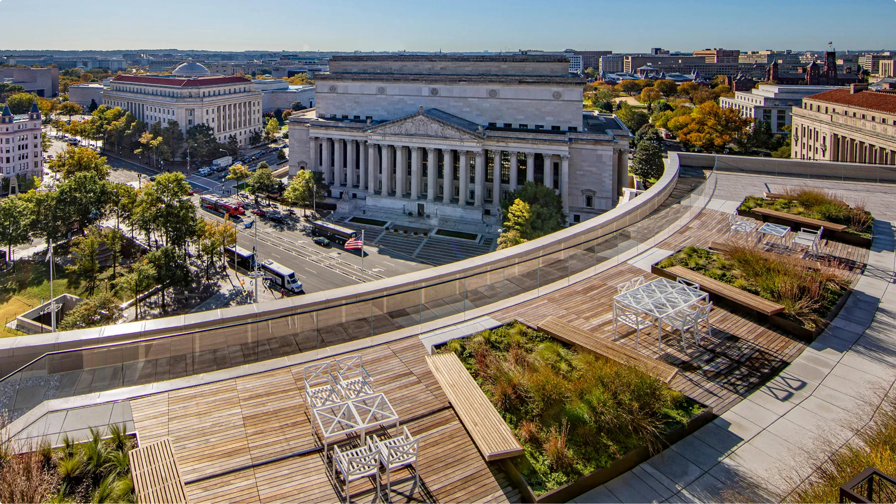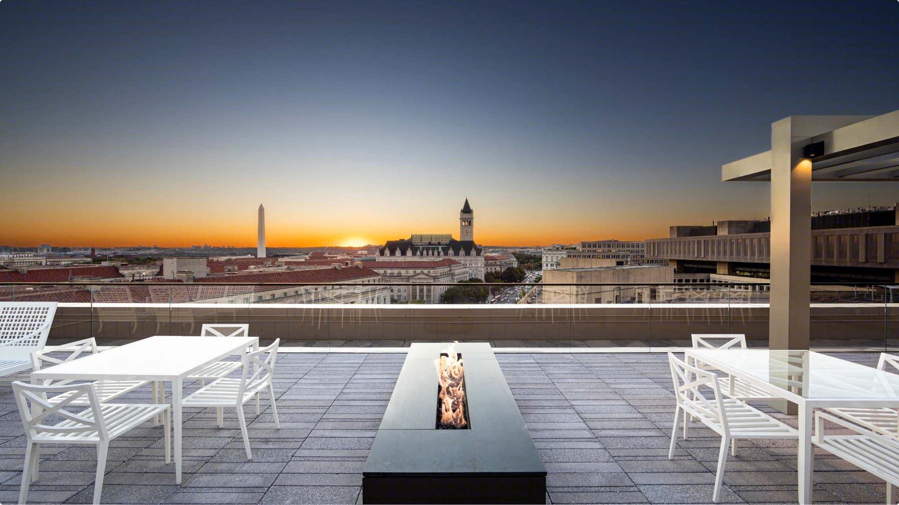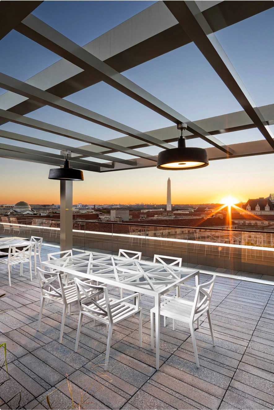 It’s hard to imagine a more intriguing spot than Market Square. Shaped in a hemicycle—like two Neoclassical half-moons—these notable mixed-use towers are on Pennsylvania Avenue between the White House and U.S. Capitol. When the time came for a renovation, landscape architects Parker Rodriguez contacted ORE to help redesign Market Square’s rooftop amenity terrace. The updated space is a serene perch for residents to take in the stately sights of Washington, DC.