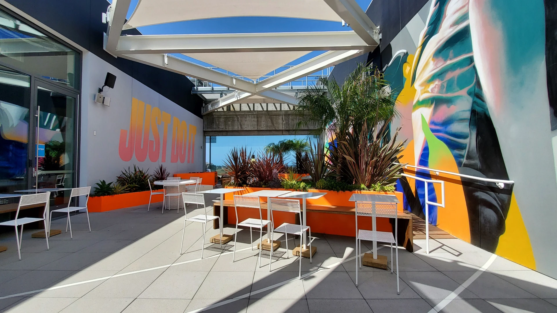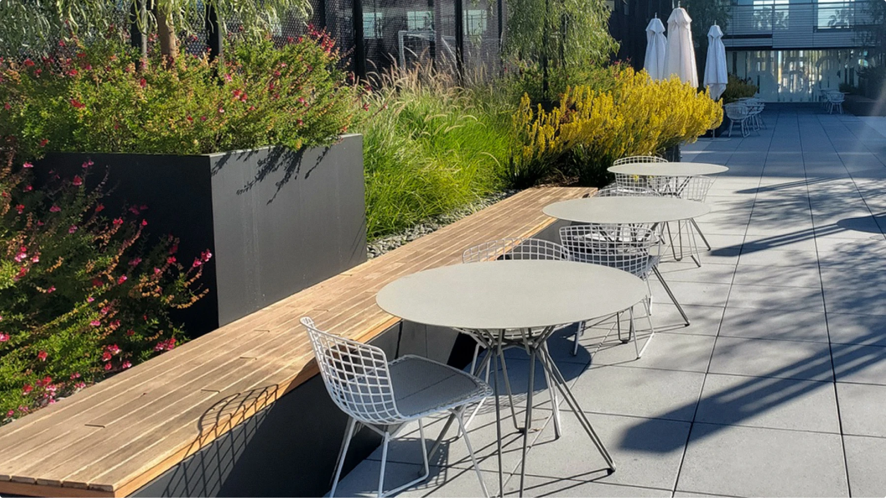 Planters powder-coated in Nike orange add a signature pop of color to a company terrace