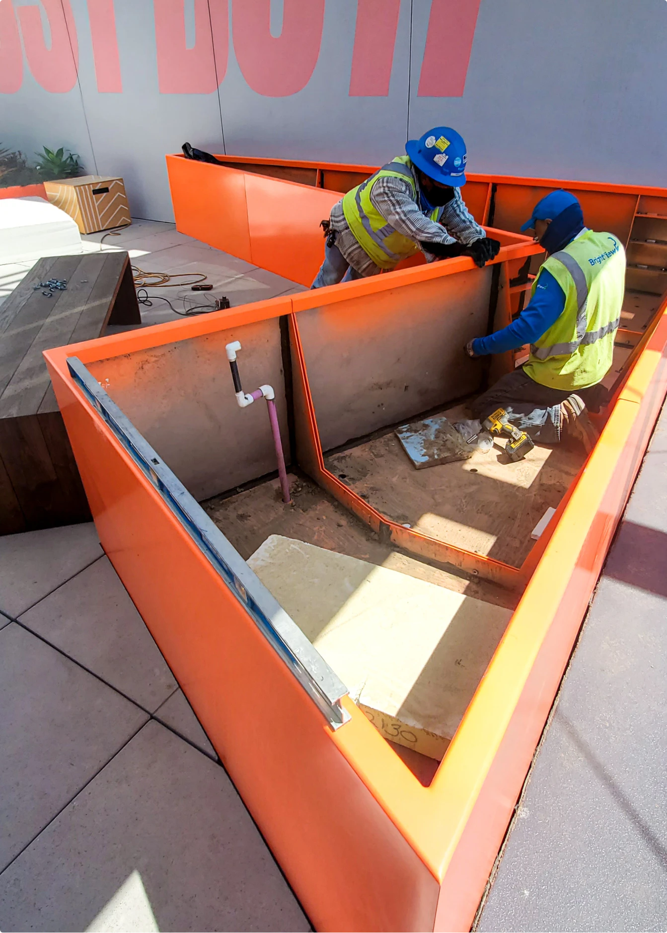 Set in the impressive WE3 at Water’s Edge building in the Playa Vista neighborhood, the terrace is a company amenity and event space. Working with Nike and BrightView, we built planters to accommodate trees, flowerbeds, and special integrated features like seating, inspection ports, and even trash cans that blend in with the aesthetic. We also installed plantings around the perimeter of the building.