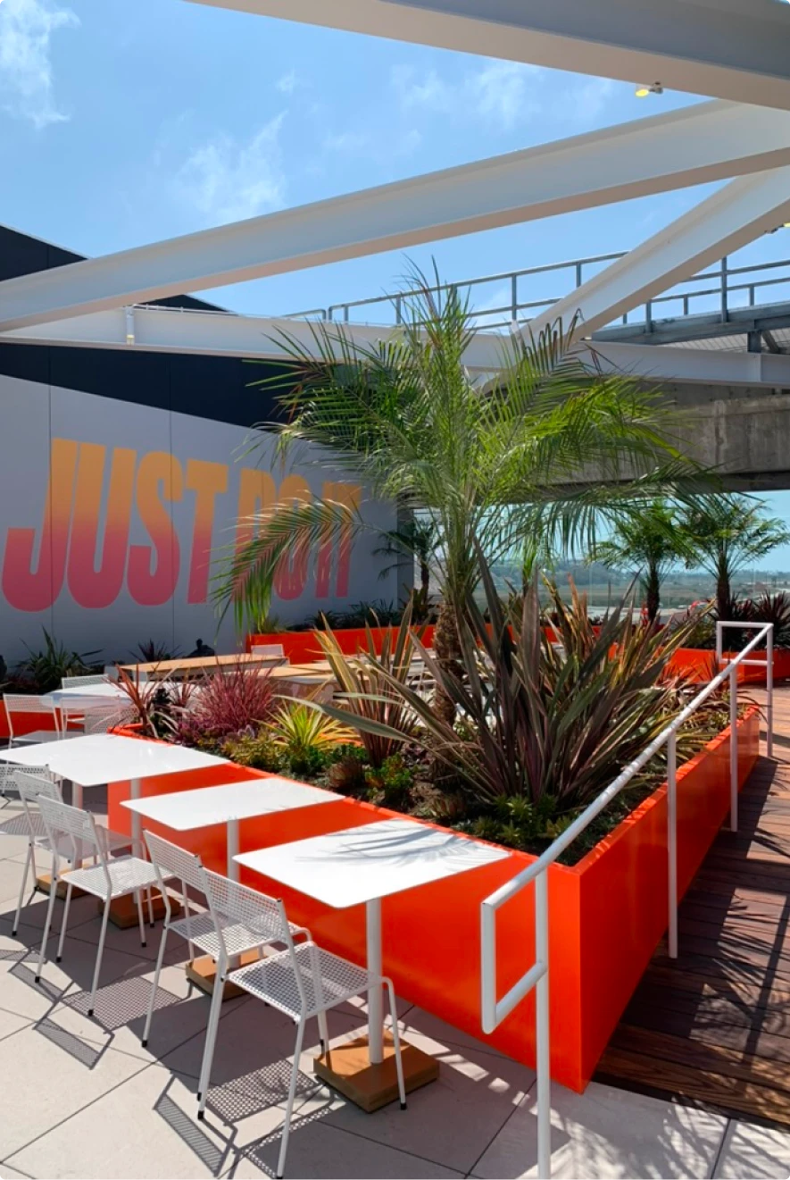 Chosen by Phil Knight in the 1970s to make his new brand stand out, Nike orange is instantly recognizable on store shelves. When ORE tackled the task of making a stand-out planter system for the company terrace at Nike’s campus on the Westside of Los Angeles, getting the iconic color right was top priority. We customized our FūSE System planters to perfectly match Nike shoeboxes and fit the energetic atmosphere.