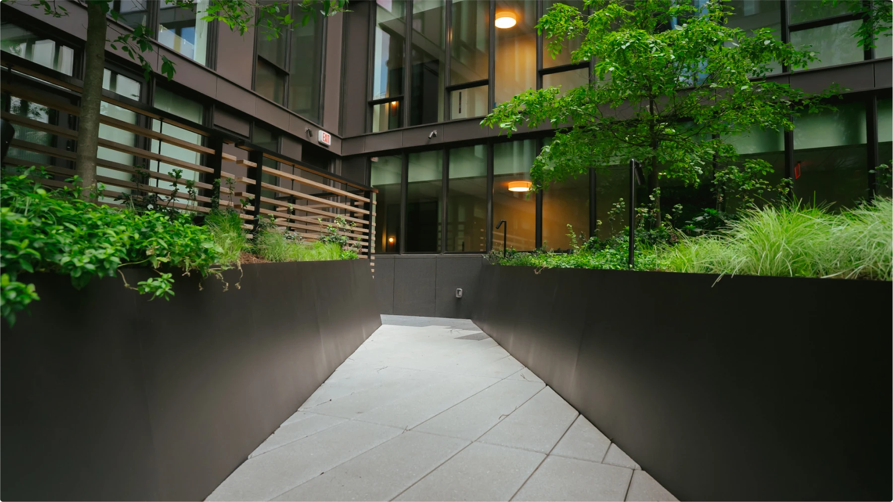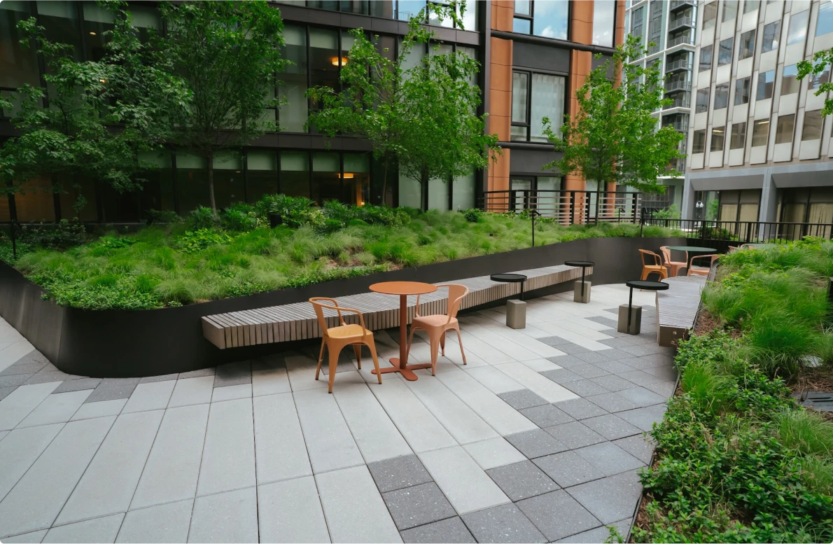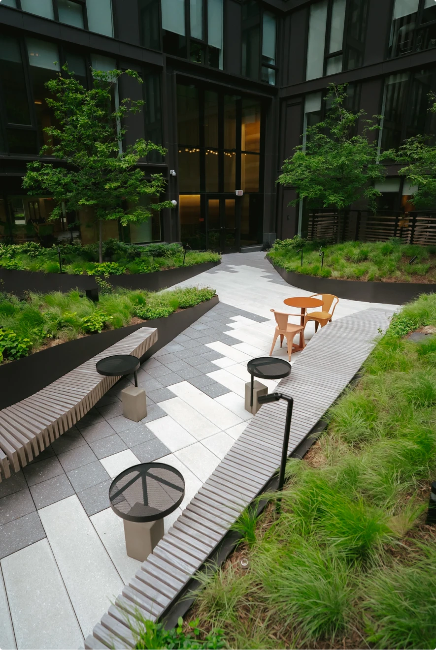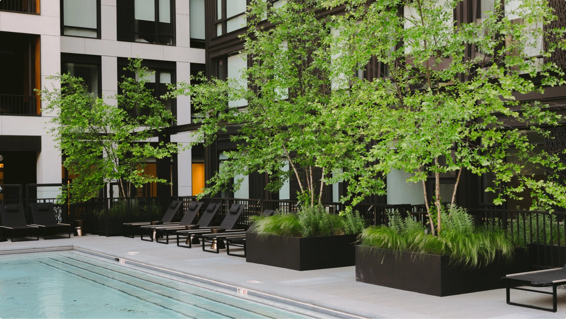 On higher levels, planters serve as façades and function as guardrails around a pool and amenity deck. These custom perimeter edges feature greenery in place of a traditional railing system while meeting safety requirements. Large planters also attach to the deck structure to house large clusters of birch trees. As for residences with private outdoor terraces, there are perimeter planters that slope toward the street, presenting foliage to the people living in the building and pedestrians below.