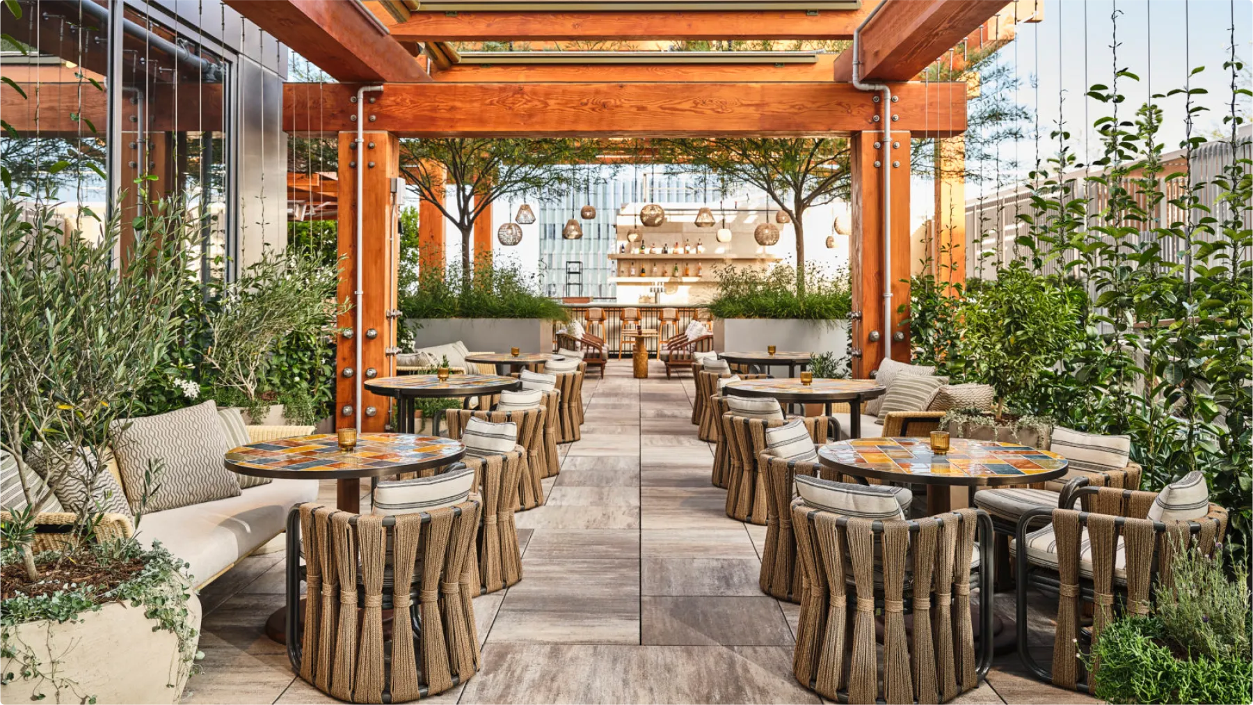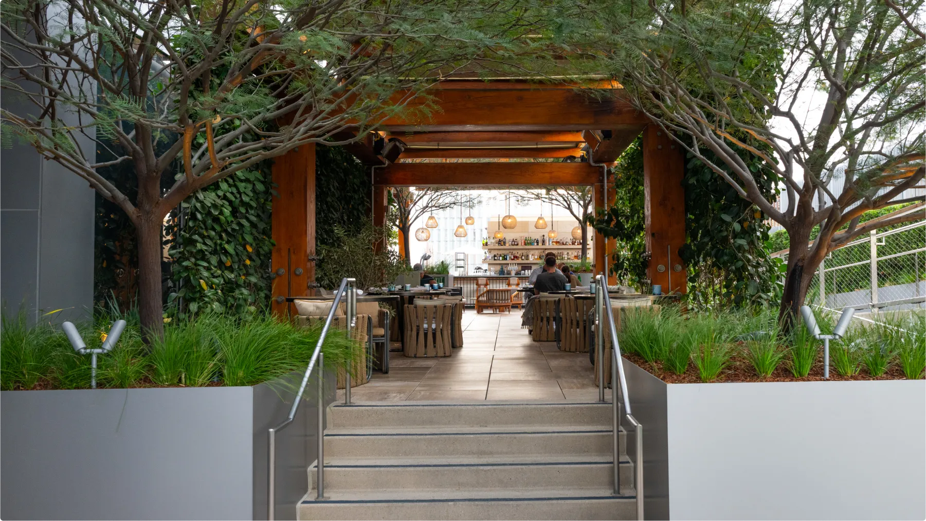 Cantilevered benches and lush plantings bring texture to lively plaza and deck areas