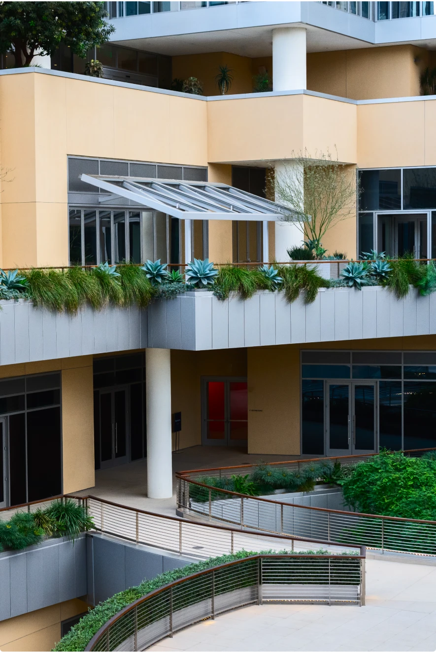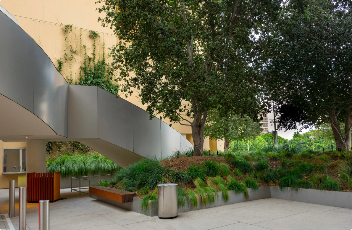 Accommodating large trees, façade plantings, and multi-story installations presented several design and engineering challenges. Of particular concern was ensuring that trees on rooftop terraces would not topple over in strong L.A. winds and that planter system attachments complied with California seismic standards. ORE collaborated with the project design team to develop appropriate planter modifications and an adjustable anchor system that met those requirements with blending in with the overall aesthetic.
