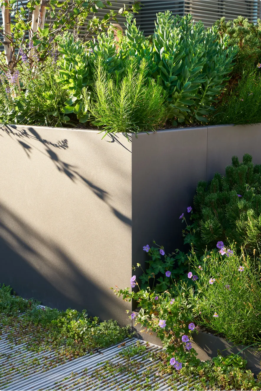 We also made custom, raised planters to lift plants to eye level. All the elements combine beautifully to provide the sheltered, lush feeling of a ground-level garden with gorgeous, 17th-floor views of the Hudson River.